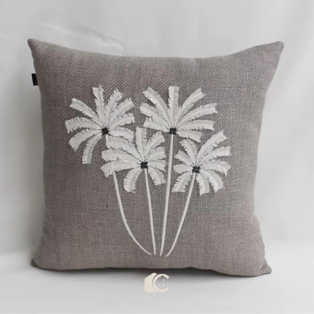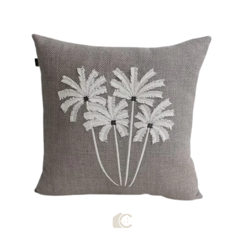 A Almofada Alaska Palm Springs Gray une o estilo tropical ao refinamento do bordado manual. Com quatro palmeiras delicadamente bordadas à mão sobre fundo cinza, transmite frescor e sofisticação, inspirada na atmosfera ensolarada e elegante da icônica cidade californiana.