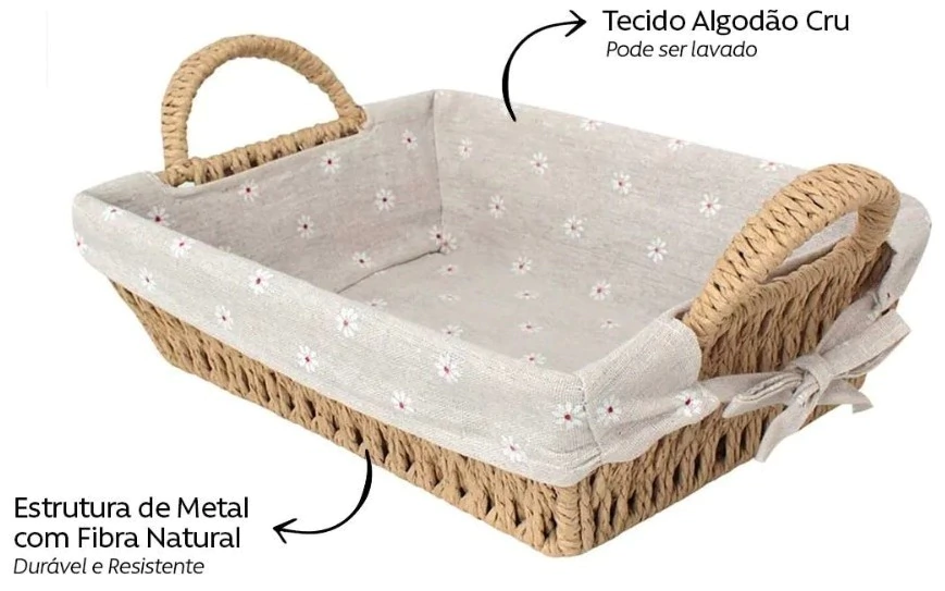 Com estrutura em palha natural, estampa floral suave e forro removível, a Bandeja Nhambiquaras P é a menor da linha e perfeita para compor cantinhos com charme.