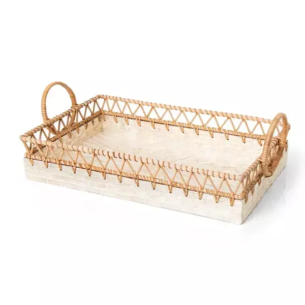 A Bandeja Perla é uma peça sofisticada que traz a elegância do oceano para dentro de casa. Produzida artesanalmente com conchas Capiz naturais das Filipinas, sua superfície reflete um brilho sutil e delicado, enquanto a borda em rattan e as alças laterais adicionam autenticidade, resistência e um charme tropical refinado.