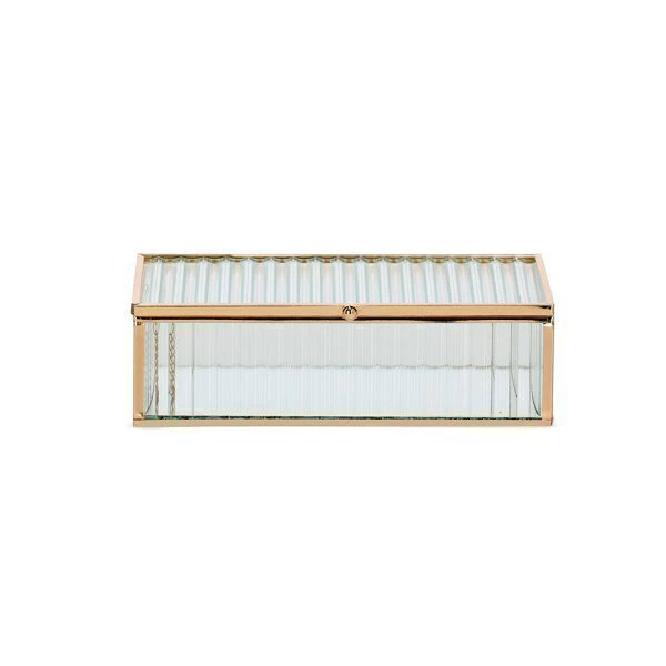 Com vidro canelado e estrutura metálica, esta caixa decorativa une elegância e praticidade. O efeito canelado confere charme extra à peça, enquanto suaviza a transparência, destacando seu conteúdo com discrição e beleza.
