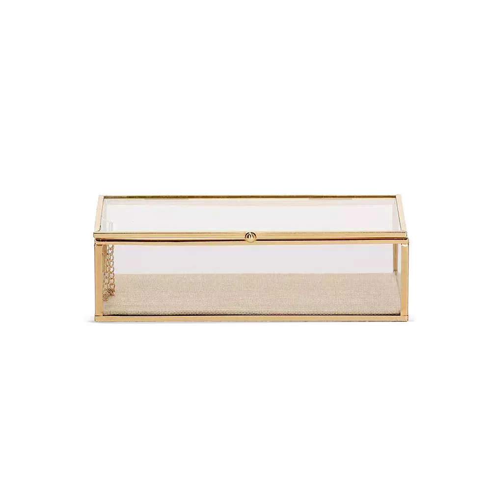 A combinação perfeita entre transparência, brilho e textura natural. A Caixa Decorativa Linho é confeccionada em vidro com estrutura em metal dourado, e traz como diferencial o fundo revestido em linho, que acrescenta sofisticação e aconchego à peça.