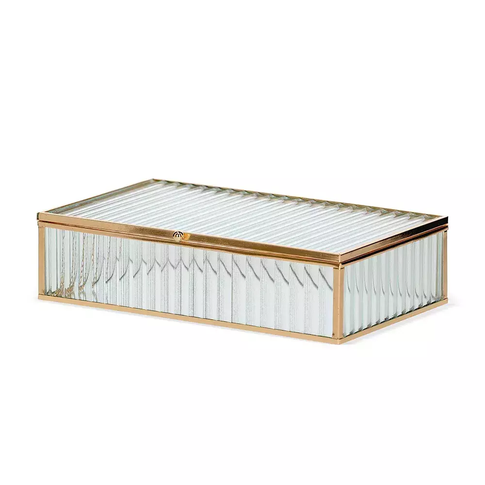 Com vidro canelado e estrutura metálica, esta caixa decorativa une elegância e praticidade. O efeito canelado confere charme extra à peça, suavizando a transparência e valorizando tudo o que está dentro — de joias e acessórios a elementos decorativos.
