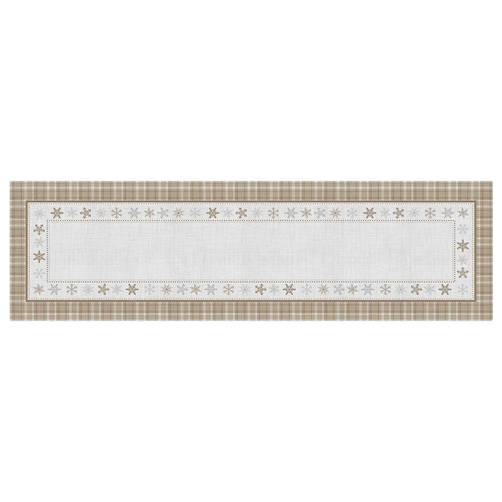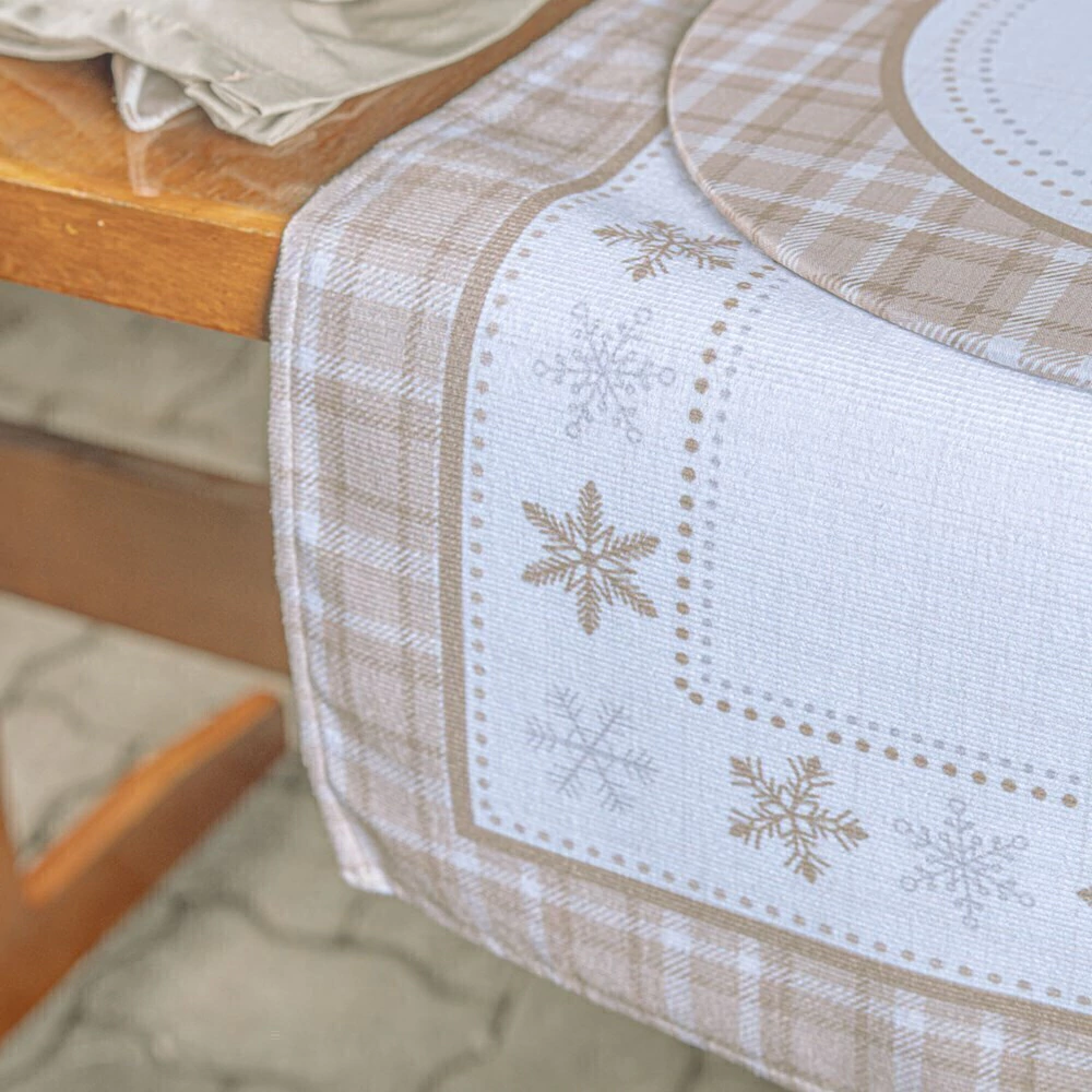 Design Aconchegante: A peça exibe um charmoso xadrez neutro nas cores bege e cru nas bordas, emoldurando o centro branco com delicados flocos de neve e estrelas em tons de bege.
