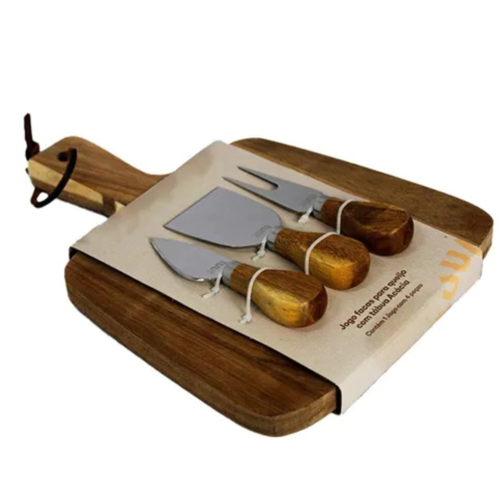O Conjunto de Facas para Queijo com Tábua em Acácia é ideal para servir e degustar queijos com praticidade e sofisticação. Produzido em madeira nobre de acácia, destaca-se pela resistência, durabilidade e acabamento refinado que realça a beleza natural da peça, tornando qualquer ocasião ainda mais especial.