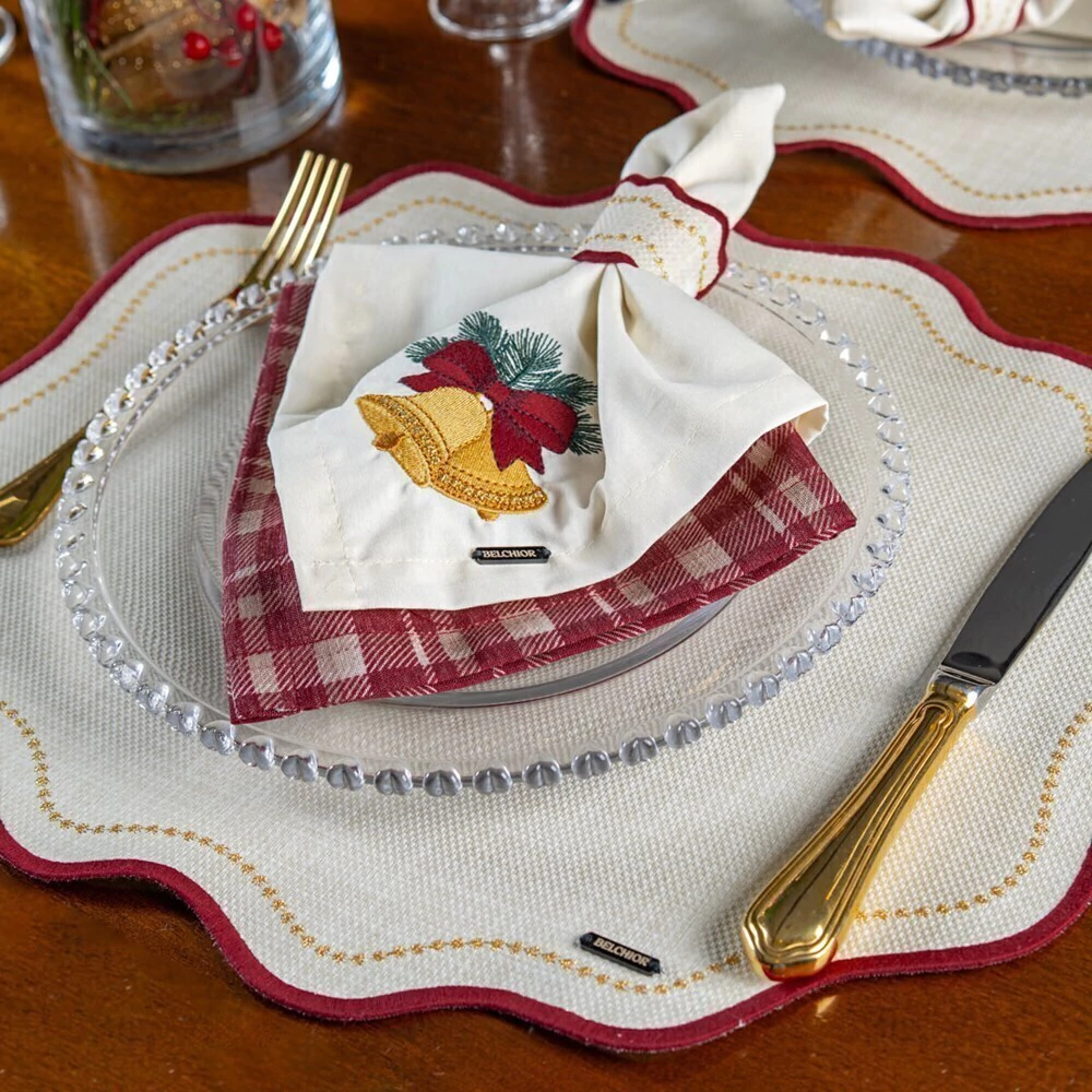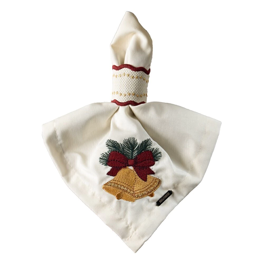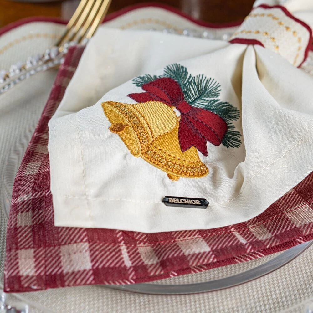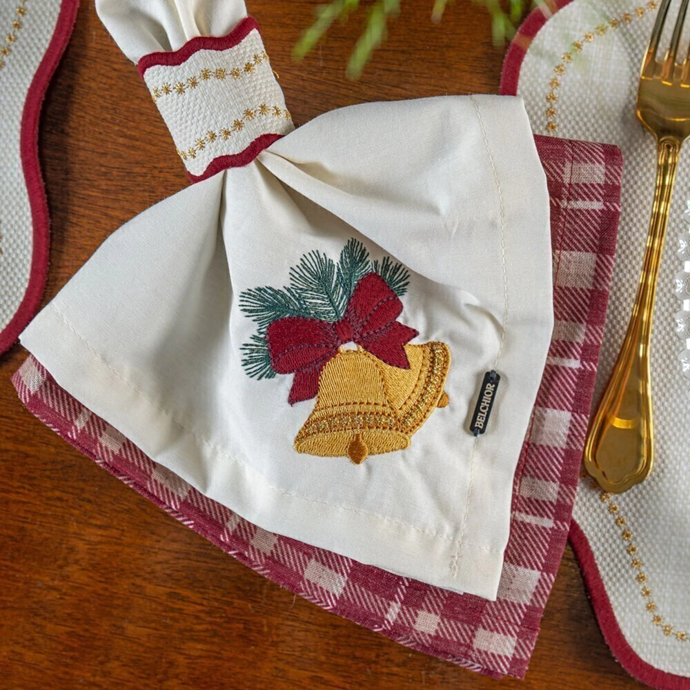 Composto por dois guardanapos bordados e dois anéis de guardanapo com acabamento refinado, o conjunto traz o clássico tema de sinos natalinos em bordado detalhado, combinando tons de taupe, bordô e lurex dourado. Cada peça foi pensada para valorizar o ambiente e transformar o momento à mesa em uma celebração cheia de encanto.