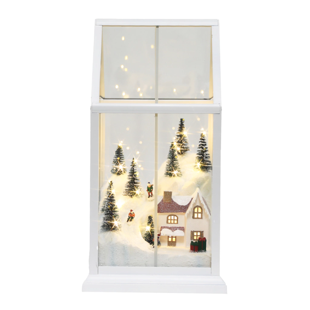 Com estrutura em formato de lamparina e acabamento branco elegante, apresenta uma charmosa cena de vilarejo coberto de neve, com pinheiros iluminados e pequenas figuras que remetem à tradição natalina.