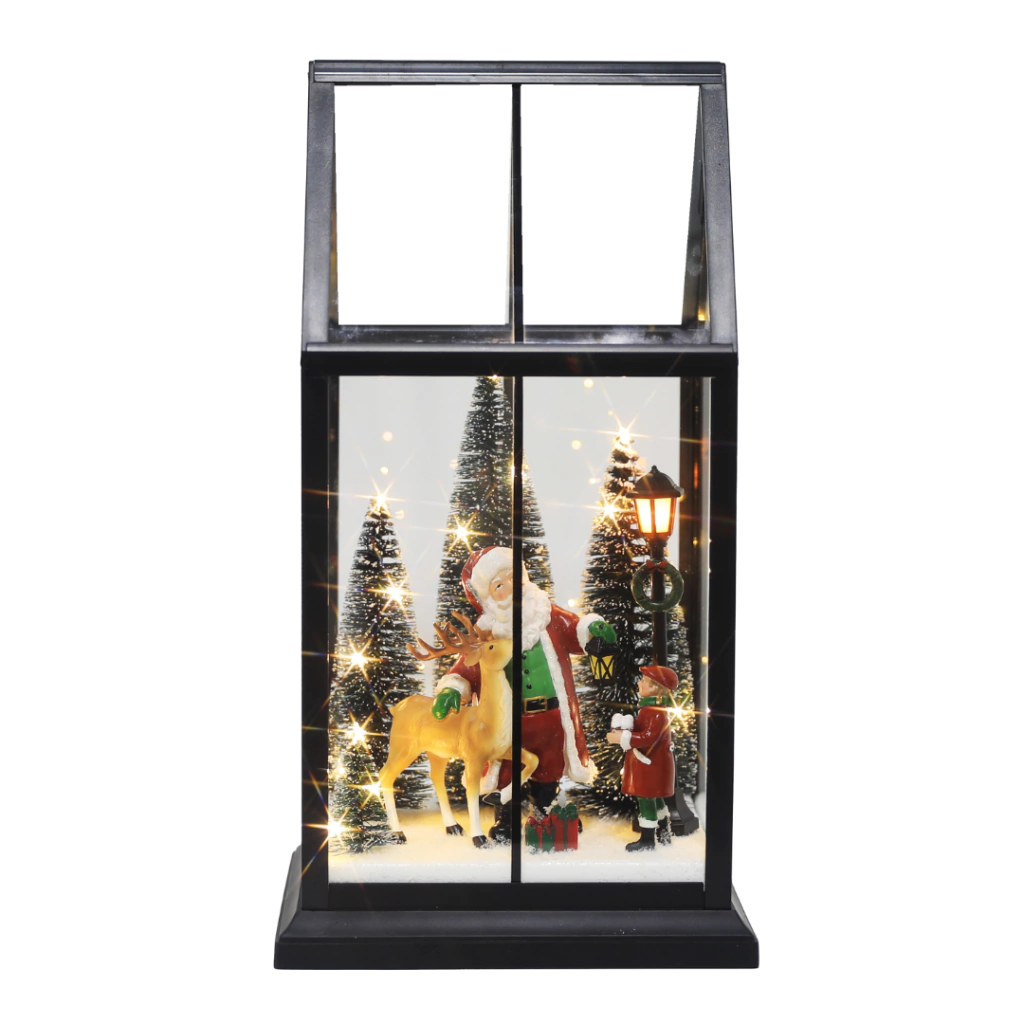 Com estrutura em formato de lamparina e acabamento preto elegante, abriga em seu interior uma cena iluminada de Natal com Papai Noel, rena e pinheiros cobertos de neve, criando um efeito acolhedor e mágico.