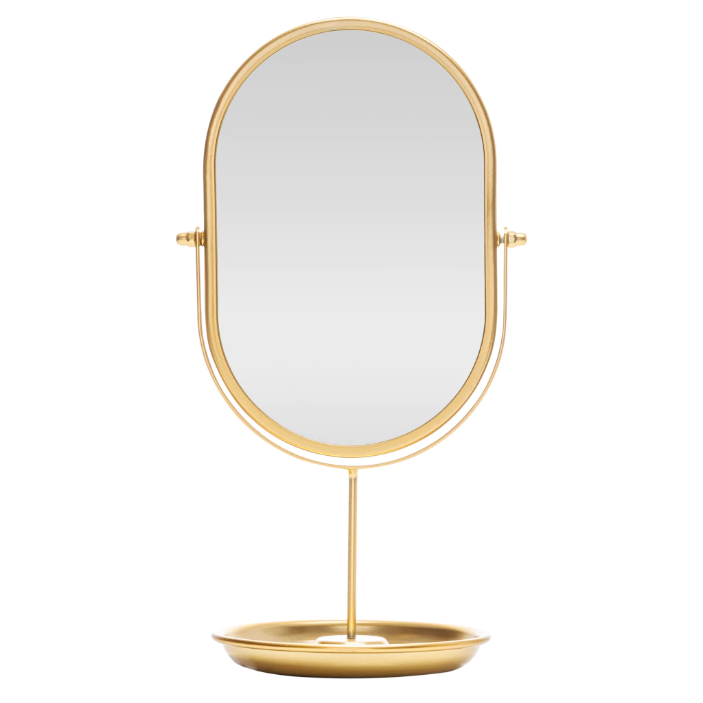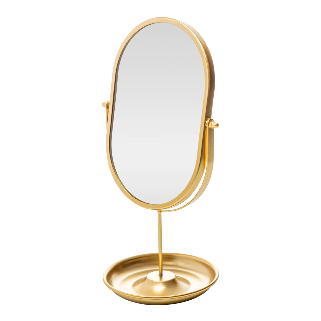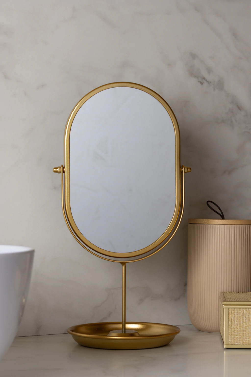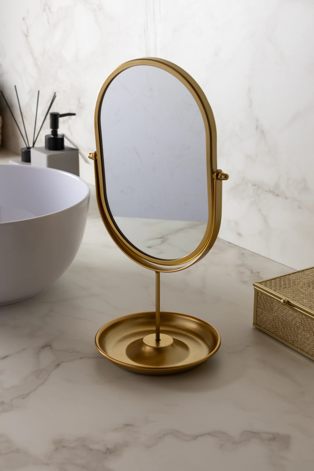 Com estrutura em metal dourado, traz um visual contemporâneo e refinado. Seu sistema giratório permite ajustar o ângulo de visão com facilidade, enquanto a base com compartimento oferece espaço para organizar pequenos objetos, como joias, pincéis ou acessórios.