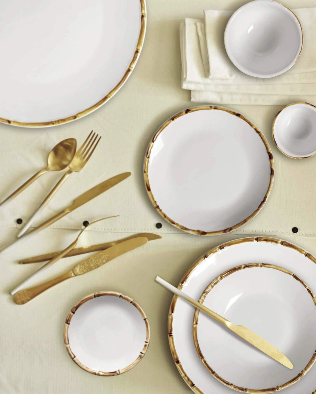 O Jogo com 6 Pratos Rasos da Linha Bambu traduz elegância, naturalidade e sofisticação. Produzidos em cerâmica branca de alta qualidade, recebem acabamento esmaltado brilhante que realça sua delicadeza, com bordas texturizadas em dourado acobreado, inspiradas no caule do bambu.