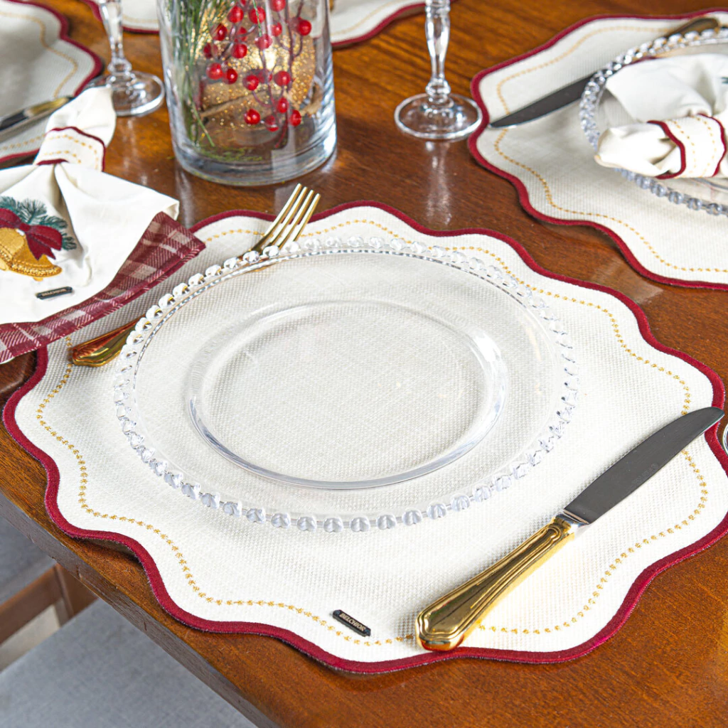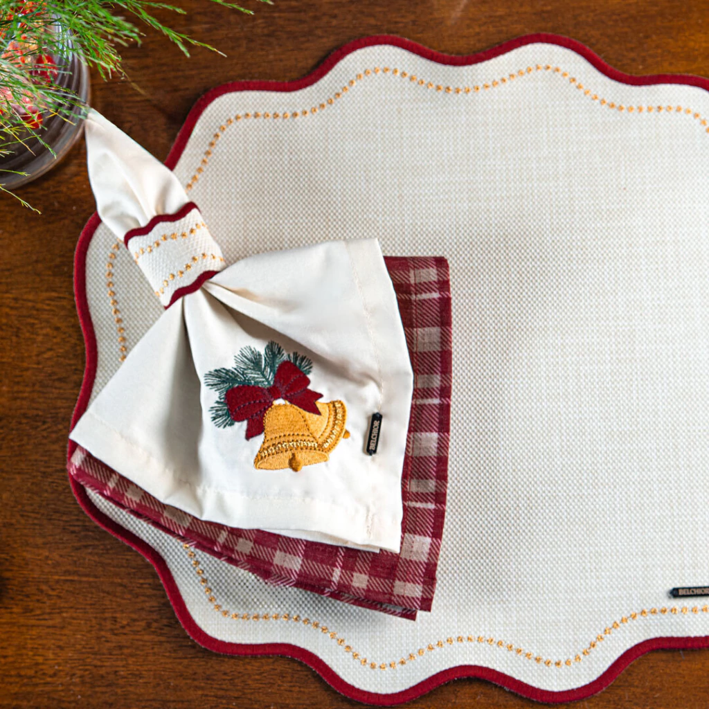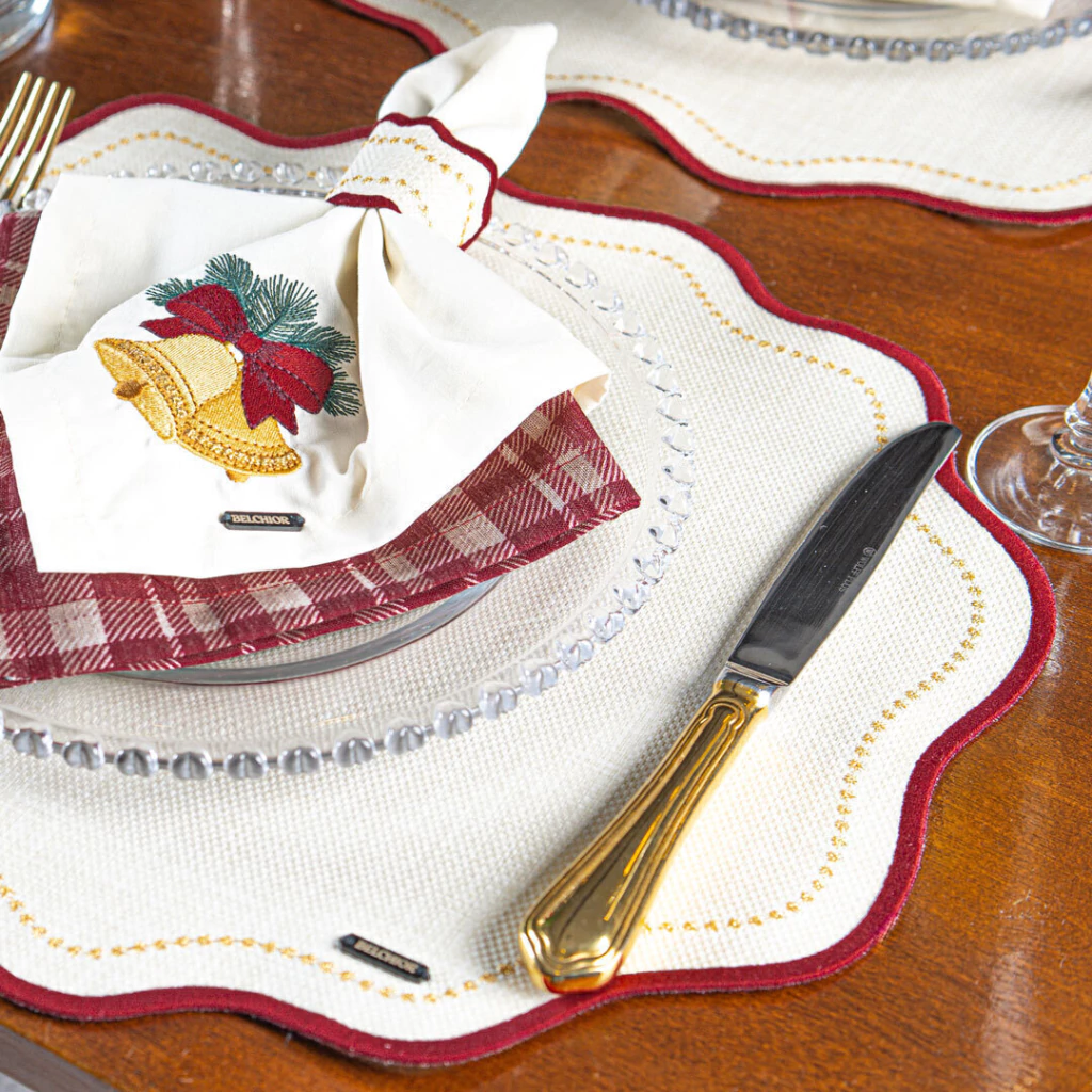 O Lugar Americano Toque de Luz Bordo combina o charme das festas natalinas com o toque acolhedor da decoração The Cozy Home. Seu contorno bordô e o delicado bordado dourado trazem elegância e brilho na medida certa, realçando a beleza de cada composição.