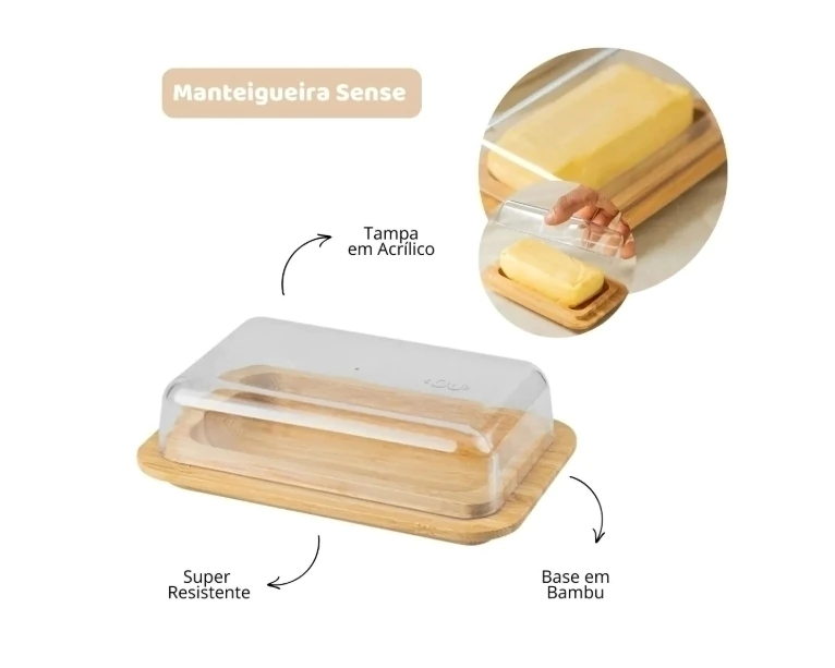 A Manteigueira Sense une praticidade e design em uma peça funcional e charmosa. Com base em material resistente e tampa em bambu natural, mantém a manteiga protegida e fácil de servir, valorizando o momento do café da manhã ou das refeições.