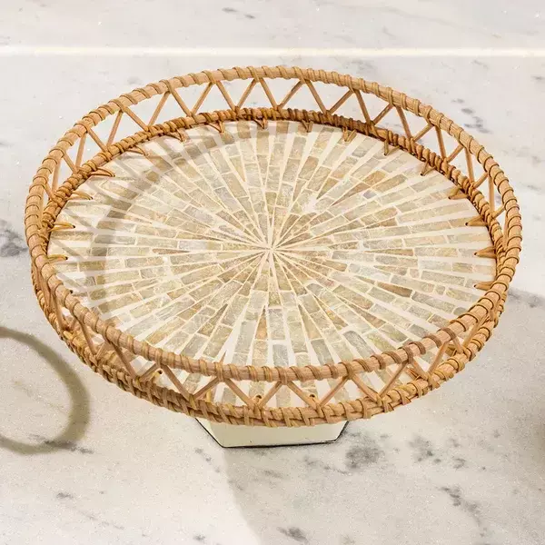A Boleira Perla é uma peça exclusiva que traduz a sofisticação do oceano em forma de design. Produzida artesanalmente com conchas Capiz naturais, apresenta brilho sutil e textura refinada que iluminam a mesa, enquanto a borda em rattan adiciona autenticidade, charme tropical e um toque natural ao acabamento.
