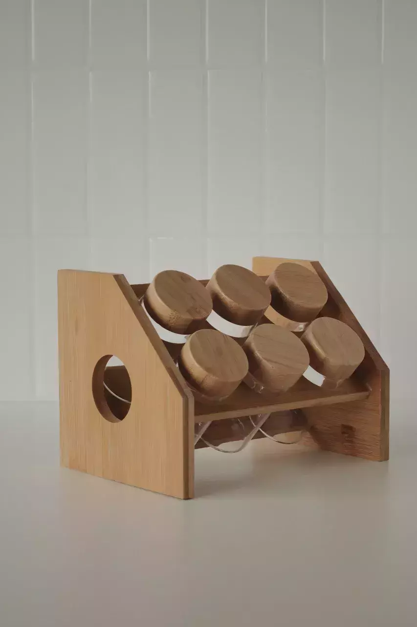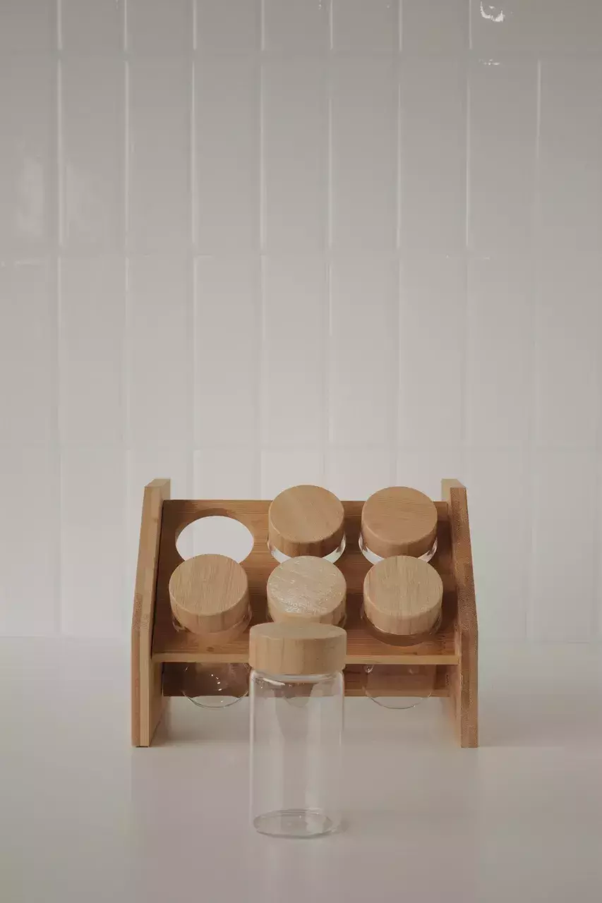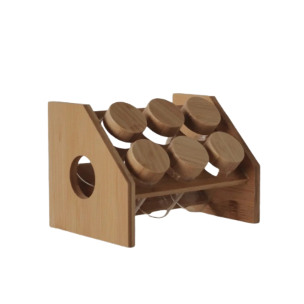 Uma solução charmosa e funcional para organizar e servir seus temperos com moda. O Porta Condimentos em bambu acompanha 6 potes de vidro com tampas, ideais para armazenar sal, pimenta, ervas e outros ingredientes essenciais da cozinha.