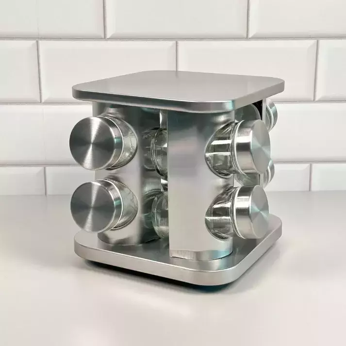 Organize seus temperos com moda e praticidade! O Porta-Tempero Pátria conta com 12 potes de vidro com tampas rosqueáveis, ideais para conservar a qualidade dos condimentos por mais tempo. Com estrutura em aço inox, o suporte giratório oferece fácil acesso aos potes e um toque moderno à sua cozinha.