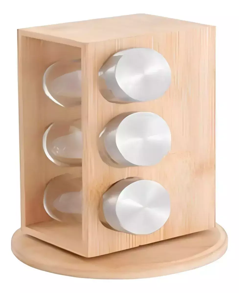 Uma solução charmosa e funcional para organizar e servir seus temperos com moda. O Porta Condimentos em bambu acompanha 6 potes de vidro com tampas, ideais para armazenar sal, pimenta, ervas e outros ingredientes essenciais da cozinha.