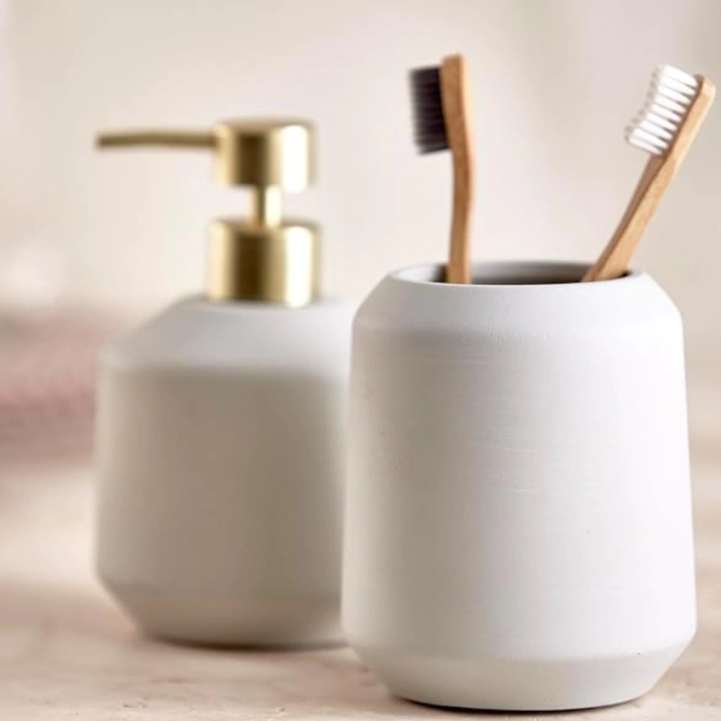 Inspirado no design escandinavo, o Porta Sabonete Líquido Oslo combina simplicidade e sofisticação em um acessório atemporal. Produzido em cimento, traz resistência e acabamento minimalista, enquanto o dispenser dourado acrescenta um detalhe refinado que valoriza ainda mais a peça.