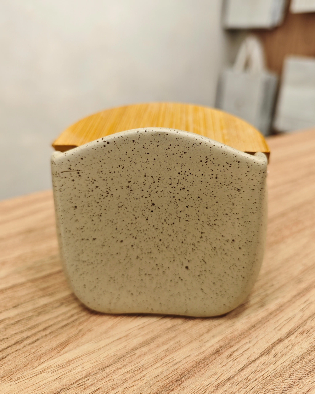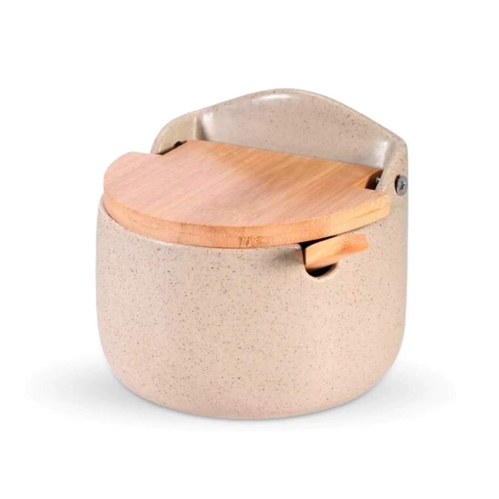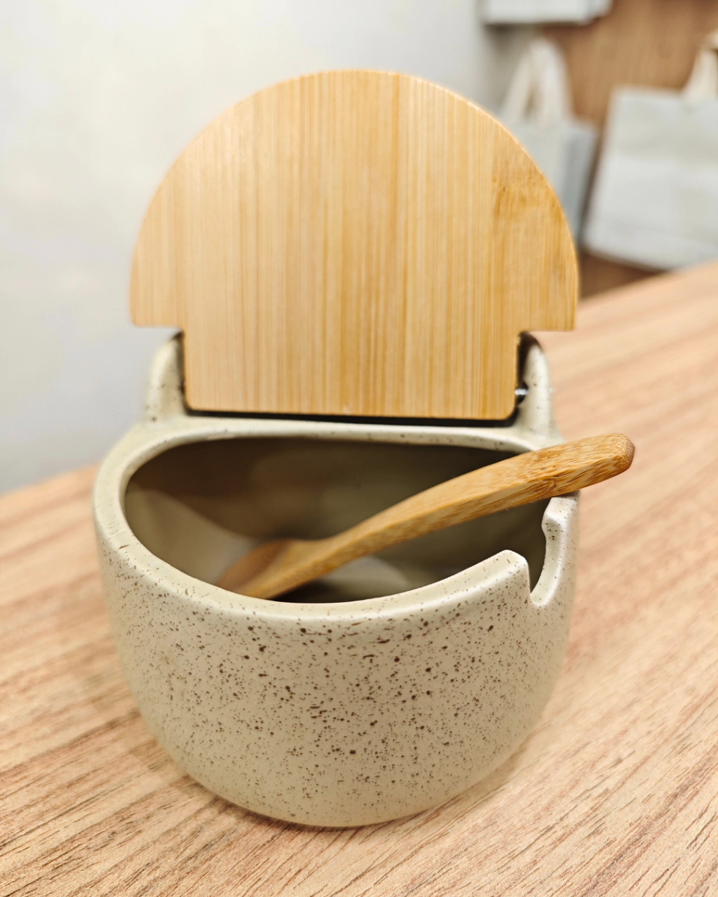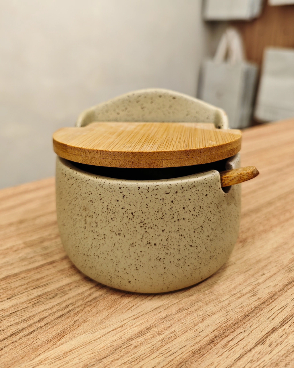 Com design funcional e delicado, o Saleiro Grano une praticidade e charme em uma única peça. Produzido em cerâmica na cor bege, conta com tampa em bambu natural que protege o sal da umidade e mantém sua conservação por mais tempo.