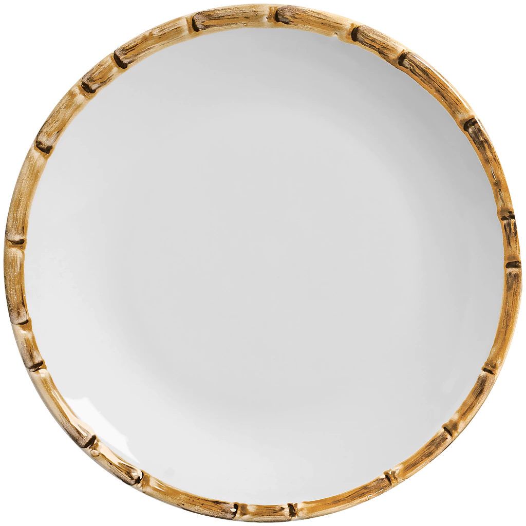 Autenticidade e sofisticação se encontram neste Sousplat em Cerâmica da Linha Bambu. Com acabamento esmaltado brilhante em branco e bordas texturizadas em dourado acobreado, apresenta formas levemente irregulares que remetem ao caule natural do bambu, criando uma peça única e cheia de personalidade.