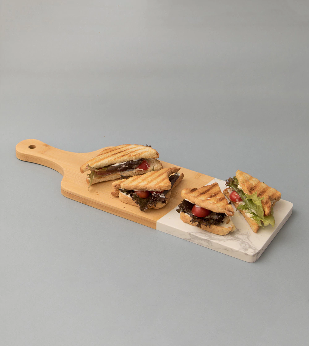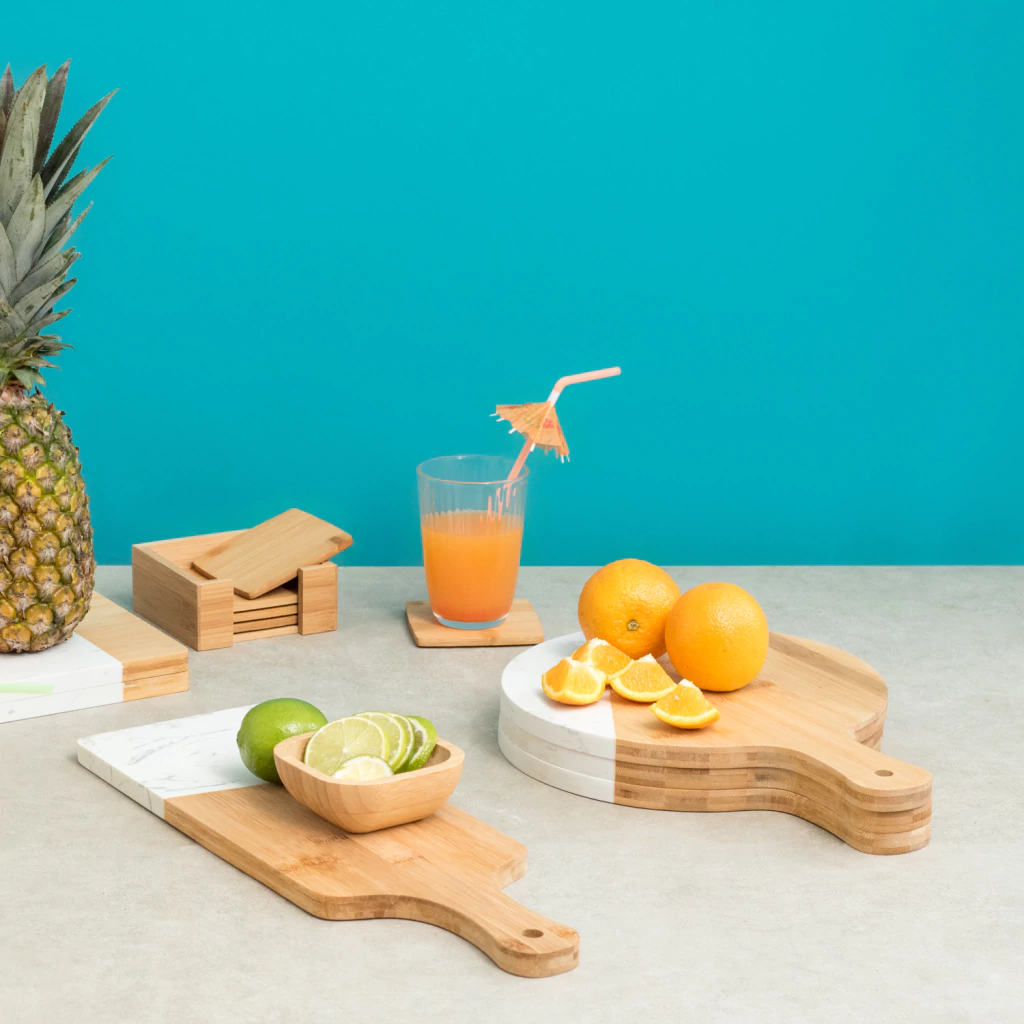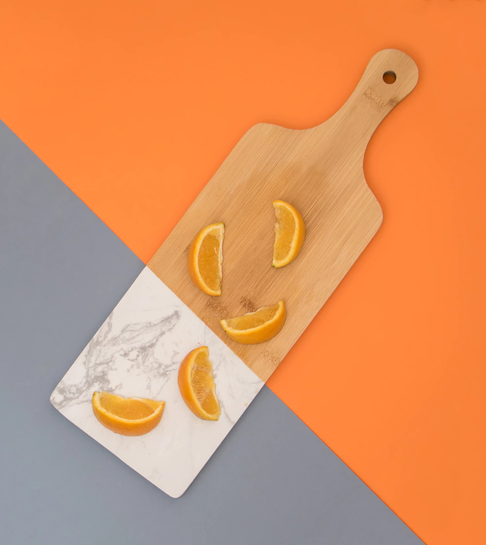 Combinando bambu natural e mármore, esta tábua é ideal para cortes variados e ainda adiciona um toque moderno à sua decoração. O design dupla face permite o uso de ambos os lados para diferentes tipos de alimentos.