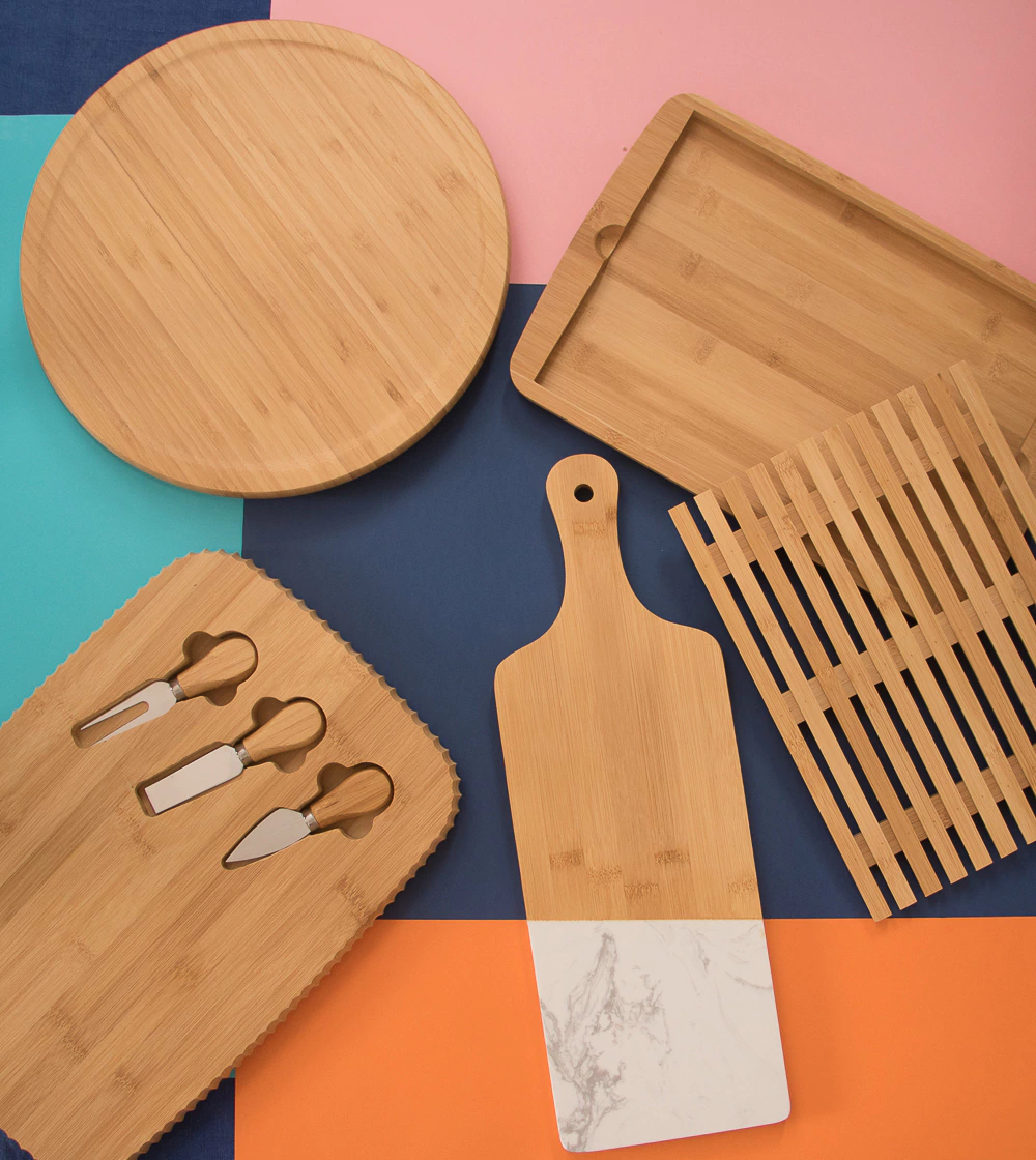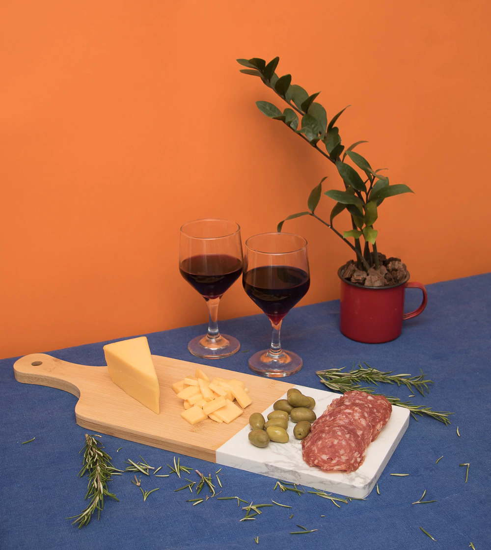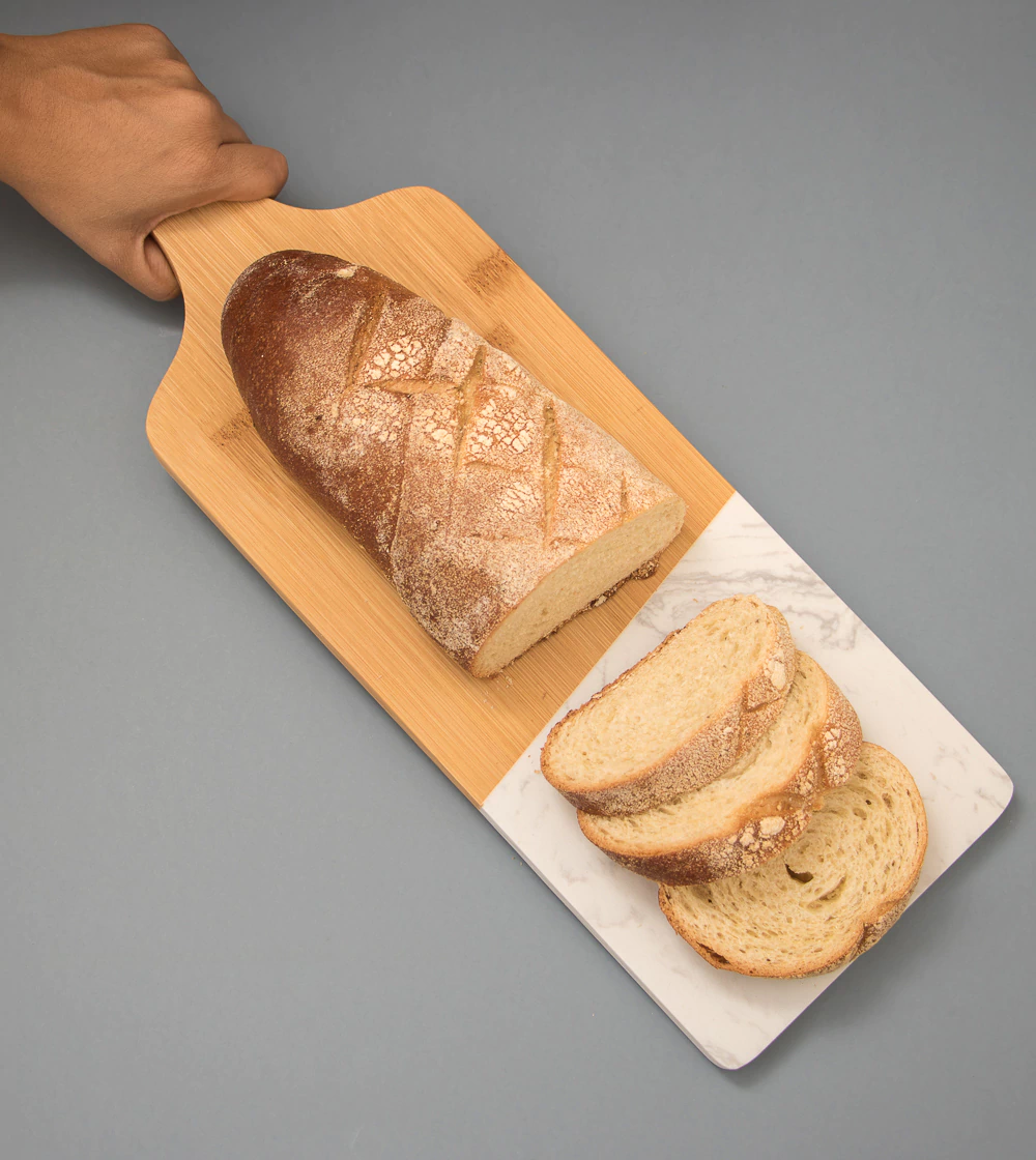 Combinando bambu natural e mármore, esta tábua é ideal para cortes variados e ainda adiciona um toque moderno à sua decoração. O design dupla face permite o uso de ambos os lados para diferentes tipos de alimentos.